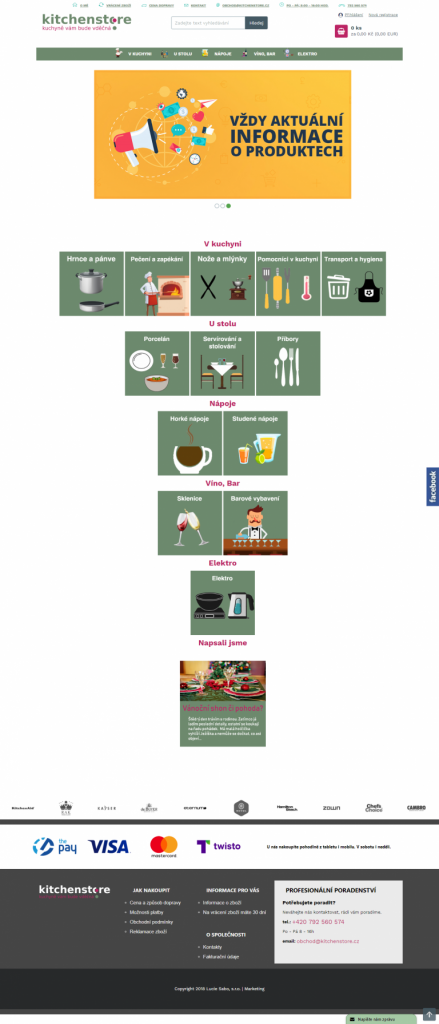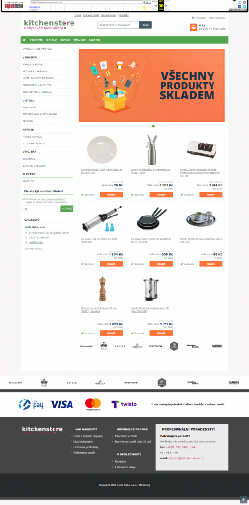 Společnost Kitchenstore je mladá rozrůstající se firma z Brušperku, zabývající se prodejem a distribucí profesionálního vybavení do kuchyní. Veškeré své obchodní aktivity, přes prvotní vyzkoušení kamenné prodejny, směřují výhradně na E-SHOPové řešení. Firma v současnosti nabízí značky takových světových gigantů, jako jsou například: