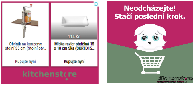 V dynamickém remarketingu jsme si zde více vyhráli a spustili jsme dvě kampaně. Jednak klasickou, která připomíná zákazníkům produktové portfolio, které si prohlíželi, aby jej nakoupili, ale taktéž jsme zkusili i méně tradiční kampaň. Tato kampaň měla za úkol informovat potencionální zákazníky o jejich produktech, které si „zapomněli“ v košíku. Na obě kampaně se můžete podívat zde: