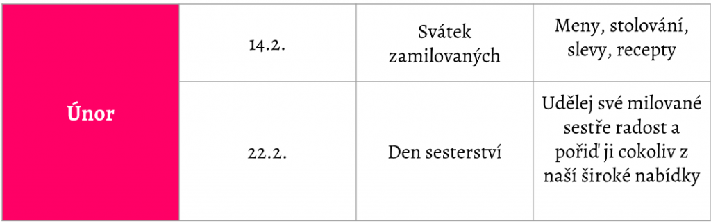 Přehledně jsme vypracovali databázi svátků a možných příležitostí k propagaci zboží nenásilnou formou tak, aby nám žádná akce neunikla a poskytli jsme zadavateli lepší přehled celého roku. Jako příklad může posloužit tahle malá ukázka z února: