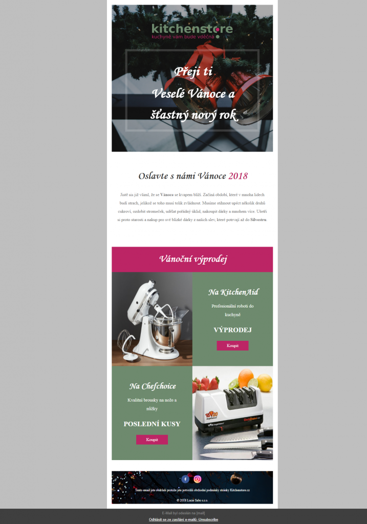 Za účelem získávání zpětné vazby od klientů bylo naším cílem i to, aby nákupní proces neskončil nákupem. Chtěli jsme přetvořit zákazníky na propagátory značky, tzv. word-of-mouth, tedy aby šířili pozitivní zkušenosti mezi veřejností. Proto jsme se zákazníky komunikovali pomocí newsletterů, ať už zasláním zpětné vazby nebo návrhem doplňkového prodeje. Například tento newsletter jsme posílali před Vánocemi, kdy jsme chtěli zákazníkům sdělit poslední možnost získání slevy 10 % na výrobky KitchenAid a popřát vše nejlepší do nového roku.